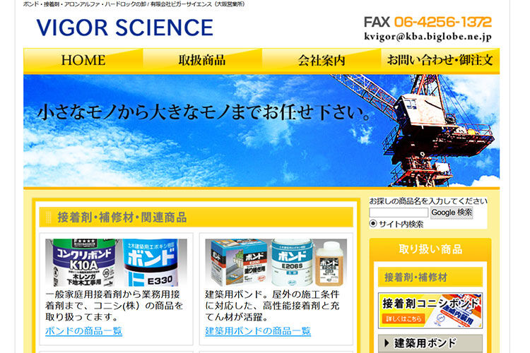 工業用接着剤、建築用接着剤など、企業向けに業務用接着剤を販売する有限会社ビガーサイエンスです。主に コニシ株式会社 / 北村化学産業株式会社 / デンカ株式会社 / 東亜合成株式会社 / セメダイン株式会社 / 近畿刃物工業株式会社 / アルプス化学産業株式会社 / 株式会社テツタニ / 株式会社ユニテック / 鈴木油脂工業株式会社 / アルファペイント株式会社 他、様々な企業様の商品をお取り扱いしております。